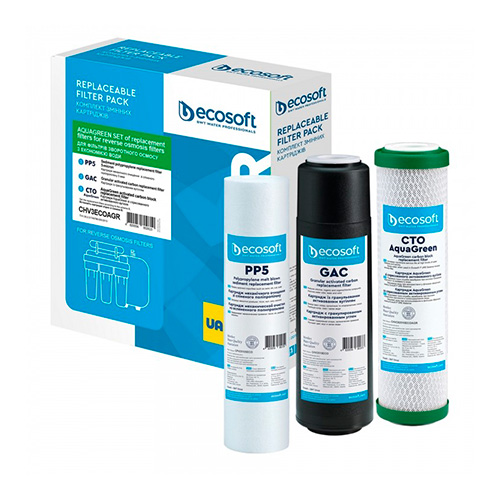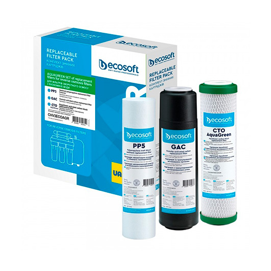 Покращений комплект картриджів для фільтрів зворотного осмосу "Ecosoft" (1-2-3) з функцією економії води Арт.CHV3ECOAGR