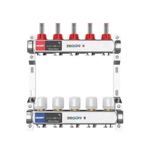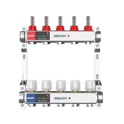 Колектор з витратомірами та датчиком температури (нержавійка) "ZEGOR" (верх+низ+кріпл.) 5 вих. Арт.QS-1853